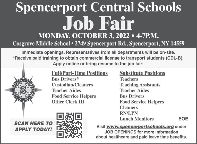 Westside News East and West Editions - October 2, 2022 3 355 Washington St. Spencerport, NY 14559 585-352-4300 NEW MEMBER DRIVE A Yearly Golf Membership (no cart) will cost $900 Golf & A Cart for the 2023 Season will cost $1,225 A Family Golf Membership (no cart) will cost $1,375 Pay a $300 deposit and get the rest of the 2022 season free. FREE GOLF! Join Salmon Creek for the 2023 Season and GolffREE foR thEREst of 2022 with a $300 deposit. 16787 Ridge Rd., HolleyEbb Tide Kennels & stables 638-5042 www.ebbtidekennels.com • Doggie Day Care • Foods • Gift Certificates • Grooming Ask about our Pet BoaRding You’ll love the care your dog or cat will receive. Dog Classes Fall Classes Starting Soon! •oBedienCe • FaRMdog PRaCtiCe •tRiCKdog • agiLitY • noSeWoRK Details on website Please contact Lori Antonelli 352-3411 ext. 133
