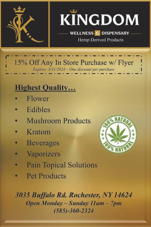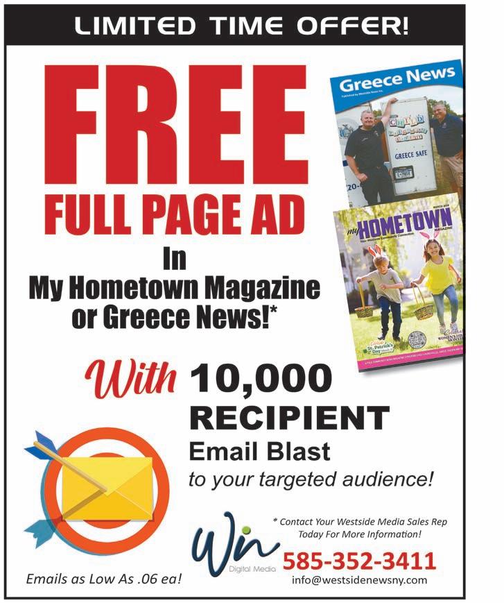 “Canalside” at 85 S. Union St., Spencerport, NY 14559 Licensed Associate Real Estate Broker 585-739-8065 585-734-3362 182 Frontenac Hts., Irondequoit $149,900 Mary Lobene 734-3362 SOLD 269 Parma Center Rd. $474,900 Mary Lobene 734-3362 Just like that...properties are selling! Call these True Professionals to “Get it Done!” GoinG, GoinG, Gone! SALE PENDING 14 Amity St., Spencerport 585.207.1816 AireServ.com The following equipment applies: •American Standard 96% AFUE single-stage furnace, up to 80K BTU •American Standard 14-Seer2 Condensor and coil, up to 3-Ton •Digital programmable thermostat •10 Year parts warranty on furnace and AC •Lifetime Heat Exchanger warranty •Qualifies for utility rebate •All forms of payment accepted and financing options are: • No interest, No payments for 6 months • Low monthly payment aprx. $135.00 for 10 years and includes yearly maintenance, filters, repairs & labor Upgrade a New American Standard Furnace and AC System before March 29, 2024 for $6,999 New SySteM $6,999