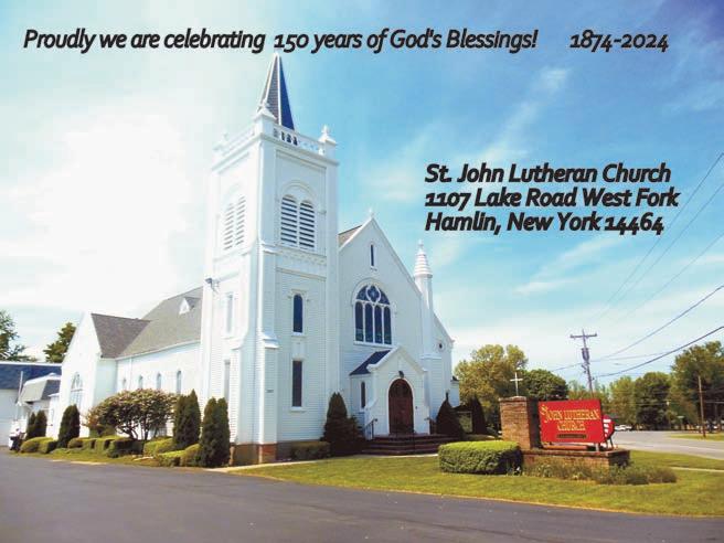 St. John’s is a place to encounter Christ in the sacraments, in community and in the Scriptures through prayer, service, and fellowship. Join us for Holy Mass at 5pm Saturdays, or Sundays at 7:45am, 9:30am, and 11:15am. Daily Mass, Tuesdays, & Thursdays at 8am and Wednesdays & Fridays at 6:30pm. Mass 9am on 1st Saturdays with Adoration until 10:30am. Confession: Monday & Wednesdays 5:30-6pm and Saturdays 3:45-4:30pm. Eucharistic Adoration: Thursdays 8am-6pm (Benediction at 5:45pm). Many great opportunities to learn about the Scriptures, Sacraments and Service for families and children of all ages. We are located at 55 Martha St., Spencerport, NY 14559. Visit our website at https://stjohnschurchspencerport. org/. E-mail sstjohnc@dor.org. Facebook at facebook.com/StJohnThe EvangelistSpencerport/. Our Pastor is Fr. Sriram Sadhanala.
