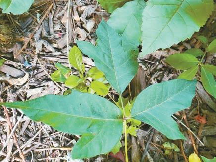 The oil in the sap of poison ivy which causes an allergic reaction is called urushiol. Be aware that all parts of the plant – leaves, stems, flowers, fruits and especially the roots (which can be exposed when it is climbing up a tree or other surface) can contain urushiol. It is present in vines before leaves appear in the spring and all parts of the plant remain poisonous even after the plant is dead. It is possible to