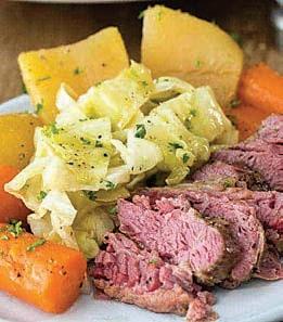 Traditional Corned Beef and Cabbage dinner with carrots and potatoes available all month!!