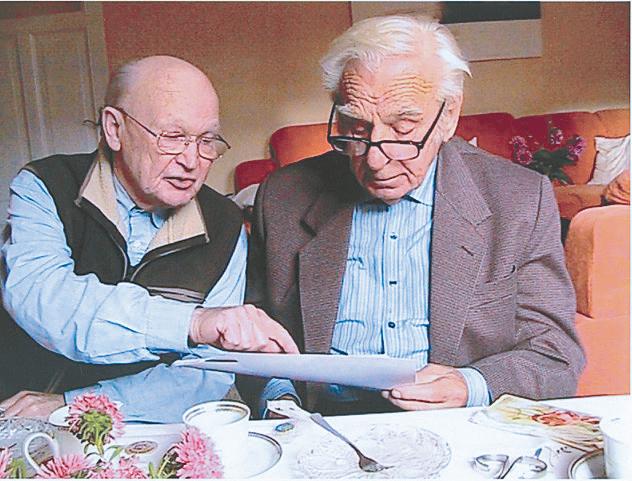 Gottfried Schultze (left) and Heinrich Willert (right) studying a copy of the Jacobs Aerial after being reunited in Germany in November of 2012. They were living 11 miles apart and were strangers. They were also strangers in 1944 when they were living in the same barracks, sleeping 50 feet apart, in the Hamlin POW camp. Provided photo