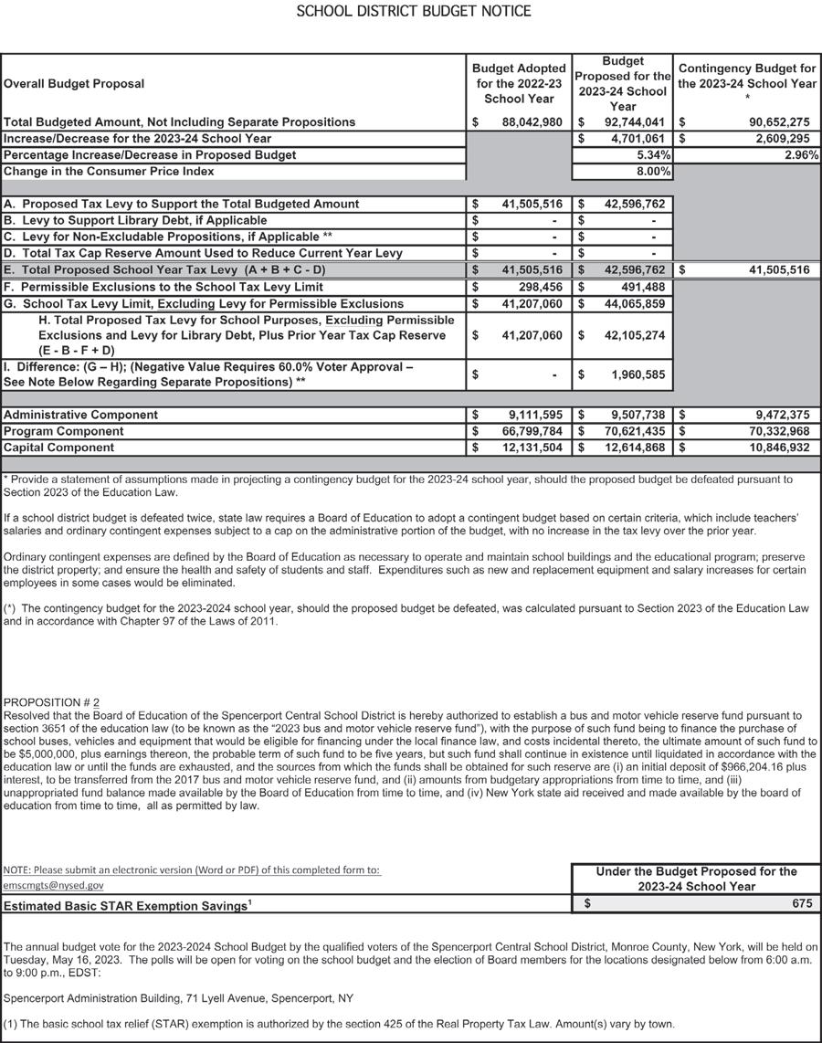 BE IT RESOLVED, THAT THE BOARD OF EDUCATION OF THE SPENCERPORT CENTRAL SCHOOL DISTRICT IS HEREBY AUTHORIZED TO EXPEND $92,744,041 AS THE SCHOOL DISTRICT BUDGET FOR THE 2023-2024 SCHOOL YEAR AND TO LEVY THE NECESSARY TAXES THEREFORE
