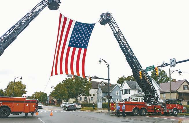 West Webster Fire Department and Spencerport Fire District flew the American Flag over Lake Avenue at the entrance to the park.