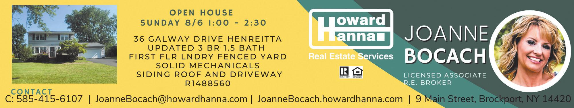JOANNE BOCACH LICENSED ASOCIATE R.E. BROCKER 9 Main Street Brockport NY 14420 585-415-67107 JoanneBocach@howardhanna.com JoanneBocach.howardhanna.com PAM KETCHUM LICENSED ASOCIATE R.E. BROCKER 9 Main Street Brockport