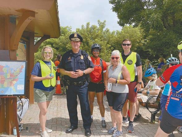 Melanie Perrault, Chief Mark Cuzzupoli, and Garrett Roe (r) greeted two cyclists in Brockport. Photo by Karen Fien.