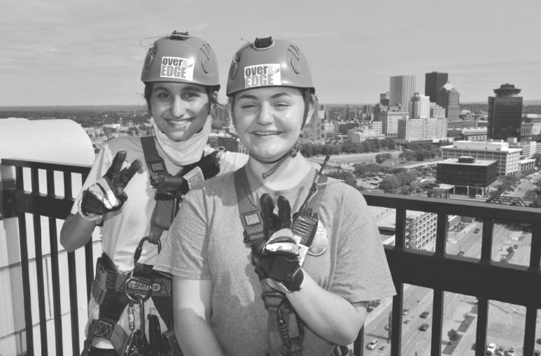 Sabrina Bhalla (left) and Ruby Callari (right) rappelling photo from 2021. Both scouts earned Eagle Scout rank in 2023. Sabrina Bhalla rappelling the Kodak Tower in Downtown Rochester.