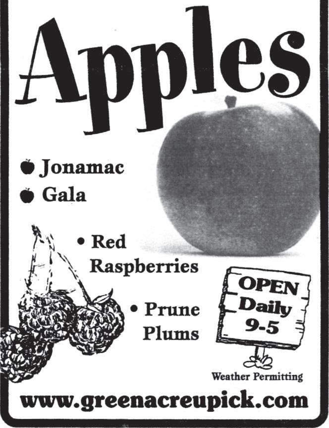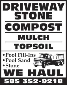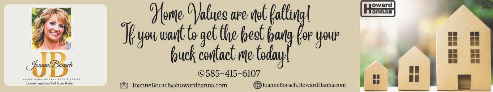 Reynolds Plumbing - Kitchen & Bath Remodeling, new homes, sewer & drain cleaning, gas lines, water heaters. Plumbing Repair Service. Call Joe 585-637-6879, cell 737-6016. [TFN] PLUMBING WEDDINGS/ SPECIAL OCCASIONS Professionally trained soloist, available to add a touch of elegance to your wedding, meeting or social event. Call 585-455-4362. [TFN] GRAVESITE MAINTENANCE Gravesite Care When You Can’t Get There! Headstone Cleaning • Edging • Mulching • Flower Planting and More! Call Laura or Jeremy at Personal Grave Site Maintenance, 585-448-2498 or email us at 2020PGSM@gmail.com. Visit us on facebook.[TFN] Over 38 Years servICe & TrUsT • Complete InsuranCe Coverage • Free estImates • reasonablerates • aerIal buCket 820-TREE (8733) Stephen C. DeVay Treeand Landscape TREE SERVICE ITEMSFORSALE/FORRENT ARTS, CRAFTS, HOBBIES REAL ESTATE TREE SERVICE The deadline for next week’s edition is Thurs. at Noon! WANTED TO BUY Wanted Old Toy Trains. (American Flyer, Lionel) and Aurora Slot Cars. Call 585455-5317.[11-6] WhileSupplies Last • Additonal Fees for Out-of-Town Delivery BCEXCAVATING, INC. FIREWOOD $75 FC Picked up • $90 FC Local Delivery $85 FC 5 or More Local Delivery Seasoned & Unseasoned Log Loads Available 585-370-7986 cell 585-352-0368 FIREWOOD/FUEL FIREWOOD/FUEL John Deere 225 - 15hp, comes with snowblower chains, roller push mower & lift stand made in 2000 well maintained $2,000 call 7483399 Leave message.[TFN] LAWN & GARDEN GIFT IDEAS GOODNIGHT SPENCERPORT rhyming story, local history, gorgeous photographs - $15. The Unique Shop. www.goodnightspencerport.com.[TFN] For sale- Ceramics, Ceramics & more Ceramics. Ready to be painted- too many to count. $1000 takes all. If interested text 585-748-1229.[TFN] NOTICE Inserts this week: • TOPS InsideallpapersinHolley, ClarendonandMurray. • GREECENEWS InsideallpapersinNorthGreece. • MYHOMETOWNMAGAZINE InsidepapersinChili,N.Chili,Ogden (partial). AUTOS WANTED Cash for your Cars, Vans, Trucks, SUV’s - $500 to $5,000 for newer models. No key, no title, no problem. Free towing. 585-482-2140.{TFN] CLASSIFIEDS 585-967-4448 Gardeners of We’Eden Leaves are fallingall around... get scheduled now for leaf raking & clean ups. Give us a call 225-7663 Starting at gENERALSERVICE PEST ELIMINATION T & C Goose Wranglers Nuisance goose removal. Simple, safe, humane. No geese harmed iN process • Fully Insured • 585-754-3078 rochestergooseremoval.com HOME IMPROVEMENT HOME IMPROVEMENT Fisher Cast Iron Woodstove - (Baby Bear) $400. 585-8204712.[11-6] MISCELLANEOUS