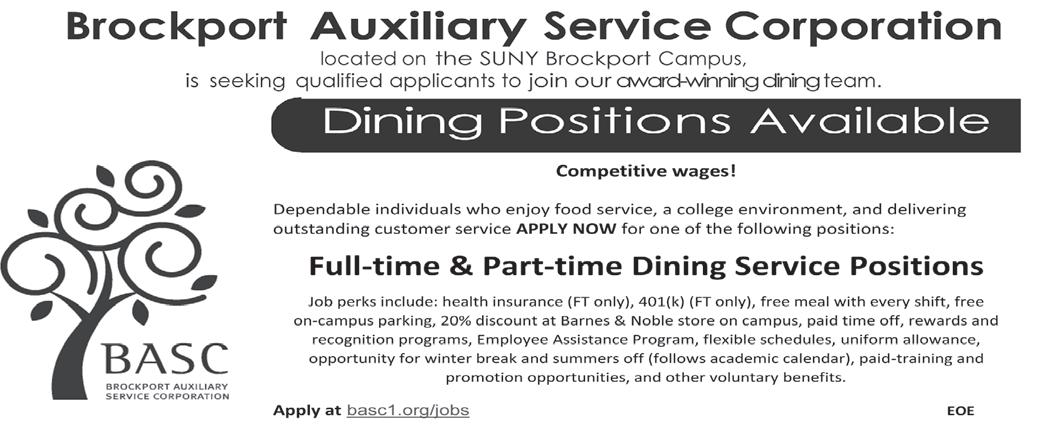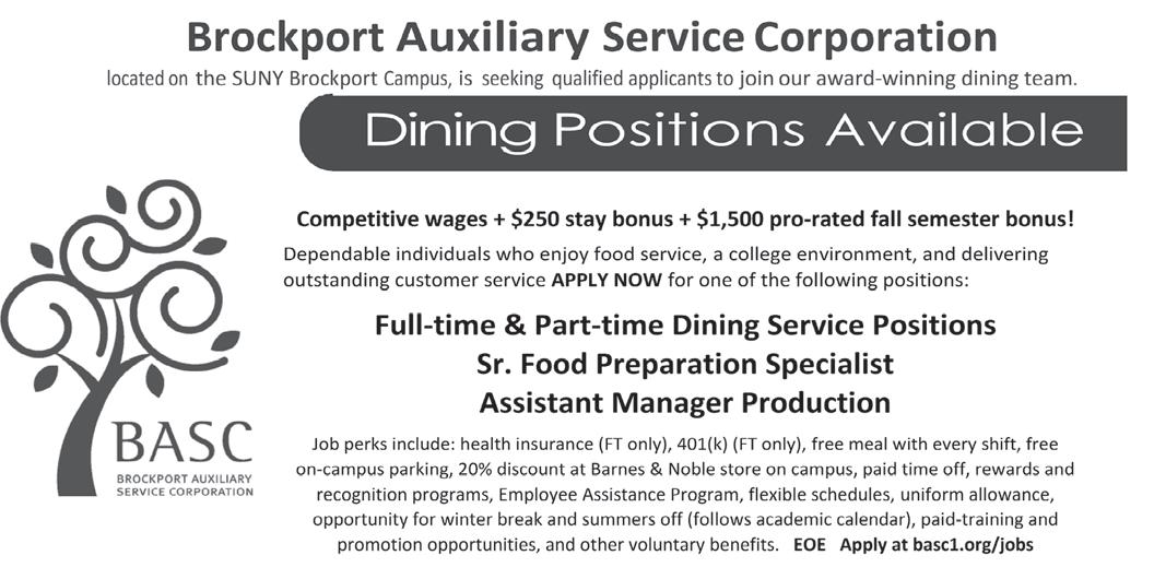 Bus/Host position: part-time evenings and weekends. Looking for friendly, professional and reliable individual. No experience needed, must possess proper working papers if minor. Flexible schedule. Apply in person or send application to 89 S. Union St., Spencerport, NY 14559. Applications can be printed at www.mccolleys. com.[10-30]