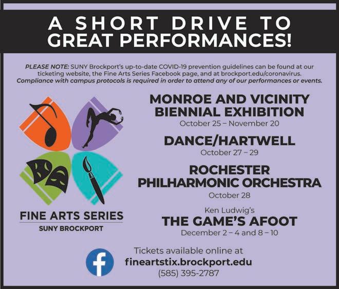 The Department of Dance at SUNY Brockport presents performances of DANCE/Hartwell on Thursday, October 27, through Saturday, October 29, at the Hartwell Dance Theater in Hartwell Hall on the Brockport campus. All performances begin at 7:30 p.m. Ticket prices for all performances are $17/general, $12/seniors, SUNY Brockport alumni, faculty, and staff, and $9/students and are available online at fineartstix.brockport. edu, by phone at 585-395-2787 or at the Tower Fine Arts Center Box Office, 180 Holley Street, Brockport. SUNY Brockport’s current COVID-19 prevention guidelines can be found on the ticketing site.