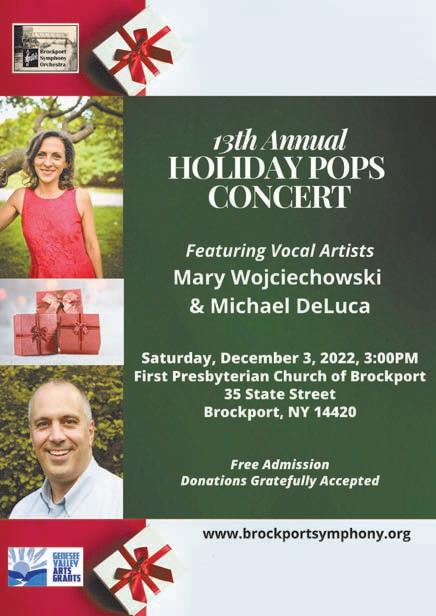 •Brockport Symphony Orchestra presents its 13th annual Holiday Pops Concert on Saturday, December 3, 3 p.m., at the First Presbyterian Church of Brockport, 35 State Street. Admission is free, and donations will be gratefully accepted. For information, visit www.brockportsymphony. org.
