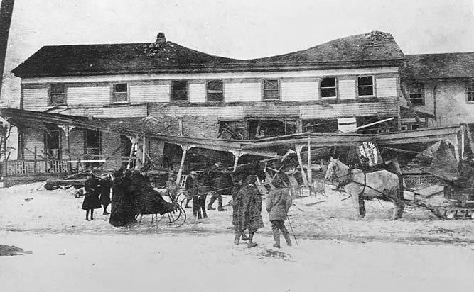 On the northeast corner where West Herr has a used car lot, there once stood an old stagecoach stop called the Manchester House and later the Winslow Hotel. It was built in the popular Greek Revivalstyle architecture and catered to travelers heading east and west on Ridge Rd over the years. It met an untimely fate in 1914 when just before a sleighing party was scheduled to arrive, the place blew up due to an acetylene gas explosion. Fortunately, photos of this event were captured. One photo, in particular, shows the arriving sleighs and their occupants. If they had arrived 20 minutes earlier, they would have been part of the disaster.