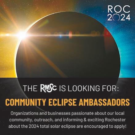 There will be a virtual information session to learn more about the program on Thursday, February 2, at 10 a.m. on Zoom. Organizations interested in applying for the RMSC Community Eclipse Ambassador program can learn more and sign up for the informational session at https://rochestereclipse2024. org/rmsc-community-eclipse-ambassadors/. Provided information