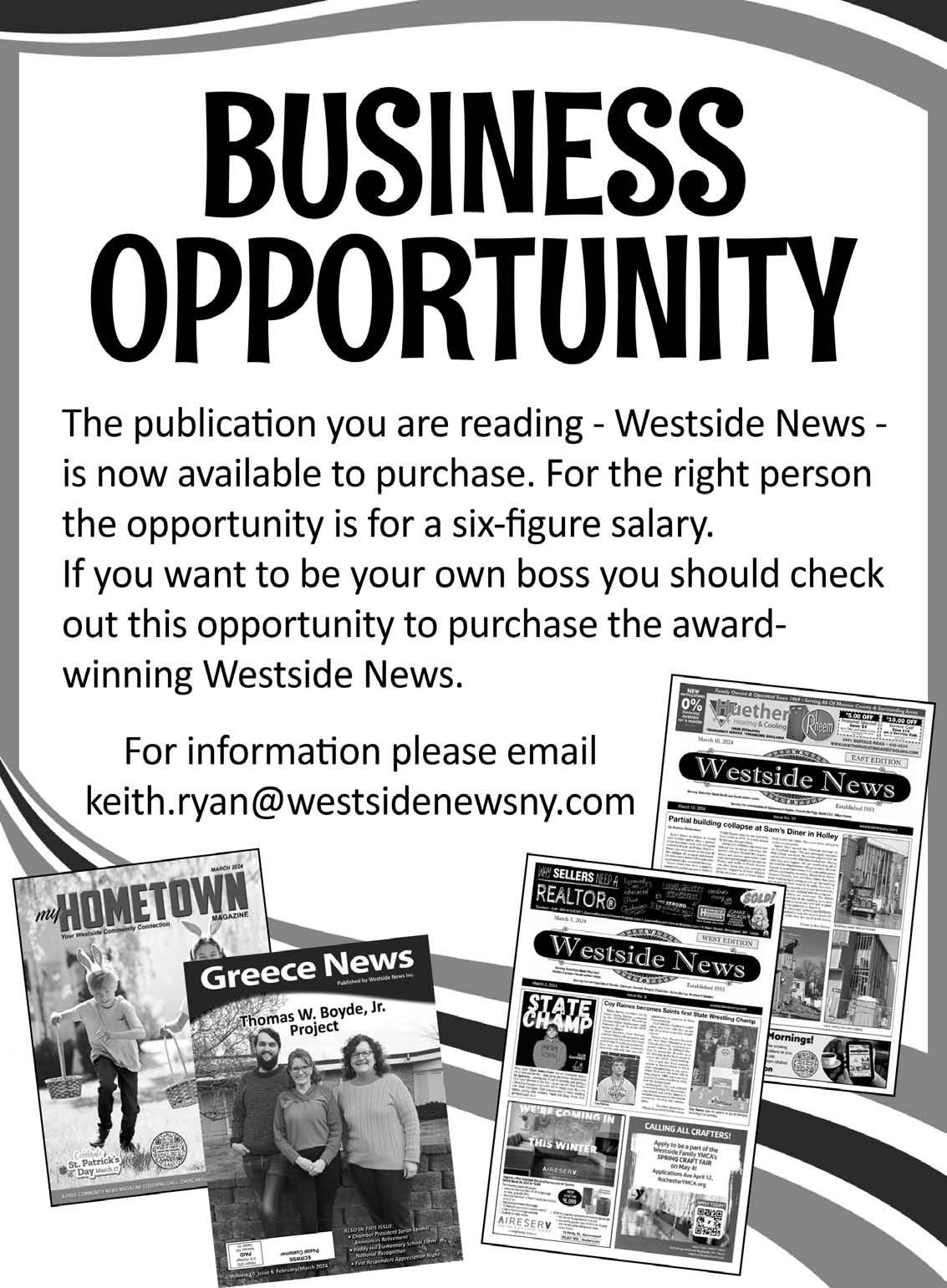 Published each Sunday by Westside News Inc., Westside News circulates by private carrier and the U.S. Postal Service to free distribution recipients and paid subscribers in Bergen, Brockport-Sweden, Chili, Churchville-Riga, Clarendon, Clarkson, Hamlin, Hilton-Parma, Kendall, North Greece, and Spencerport-Ogden. Business offices are located at 1776 Hilton-Parma Corners Road (Route 259), Spencerport, NY 14559. (585) 352-3411. Entered for mailing at Spencerport, NY 14559. Subscription rates are $50 per year; $30 for six months or less.