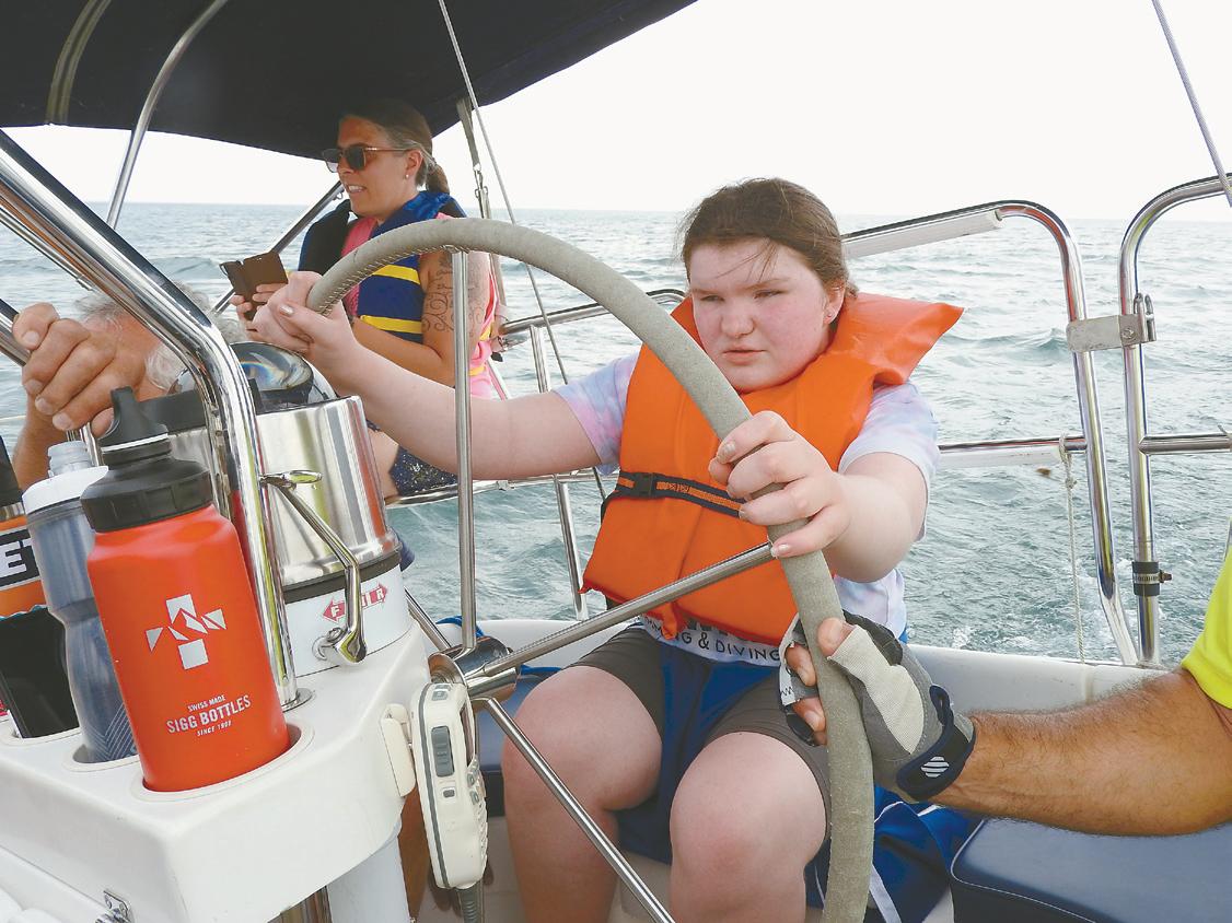 Charlotte steering the sailboat. Photo by Karen Fien.