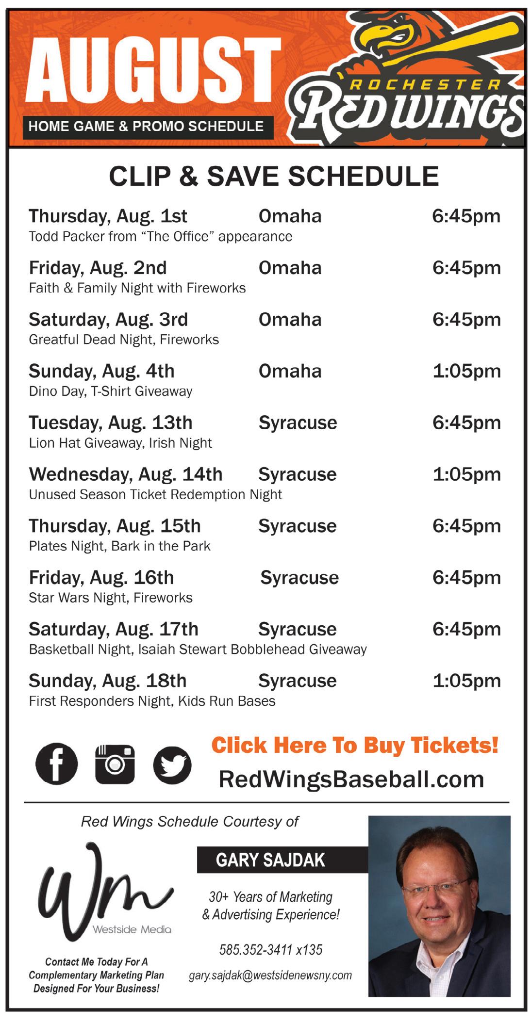 12 Rochester Red Wings August Game & Promo Schedule