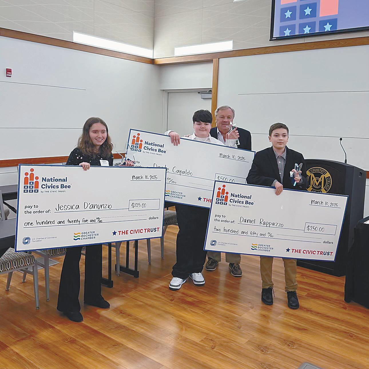 Dante Capaldo from Gates Chili Middle School took first place at the National Civics Bee local qualifier held March 10 in Rochester. The event was hosted by the Greater Rochester Chamber in partnership with the US Chamber of Commerce Foundation and The Civic Trust. Daniel Rappazo and Jessica D’Anunzio, also from Gates Chili, rounded out the top three.