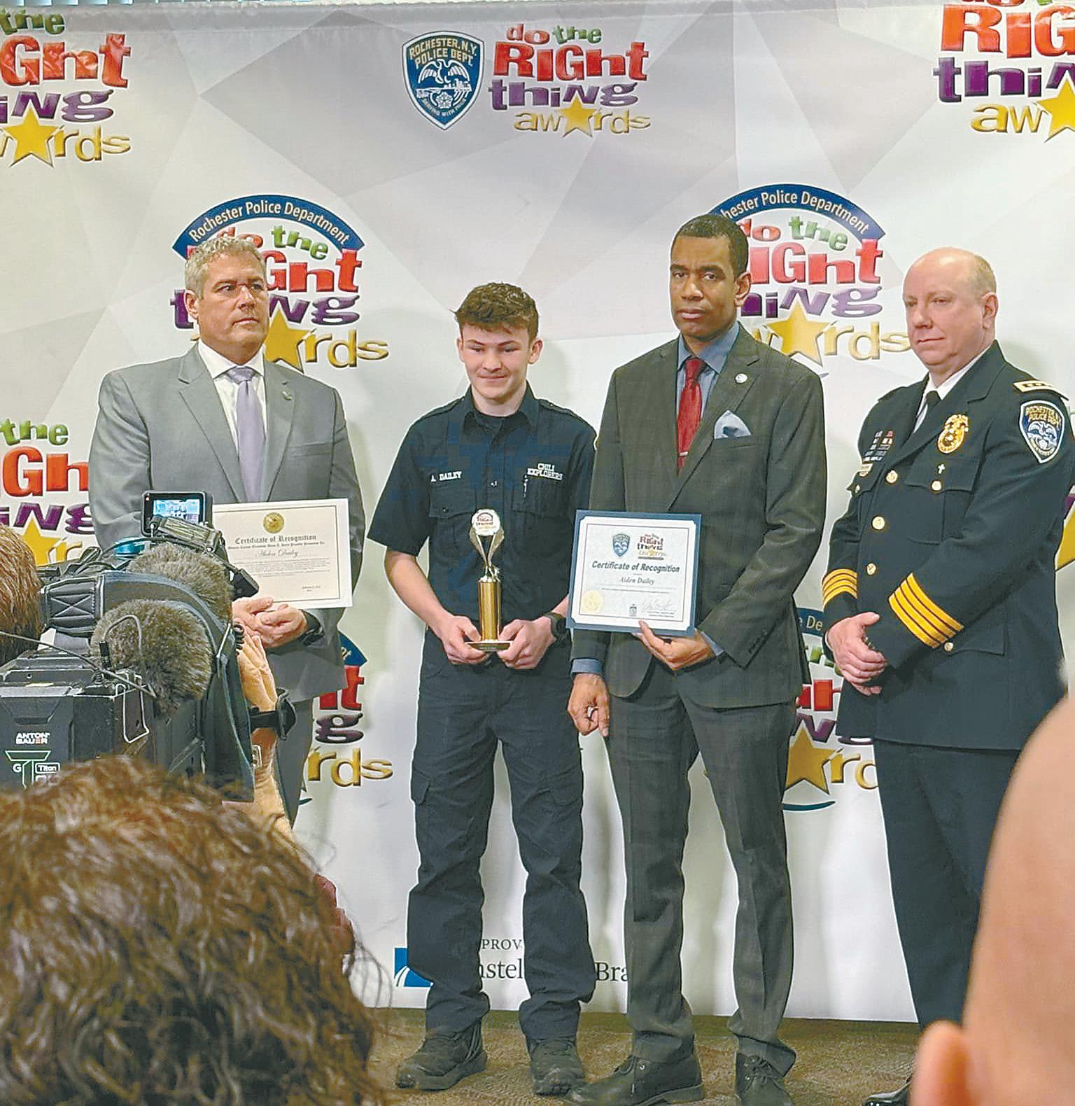Pictured at the awards presentation are (l-r) County Executive Adam Bello, Aiden Dailey, Rochester Mayor Malik Evans, and Rochester Police Department Chief David Smith. Photo from Chili Fire Department on Facebook
