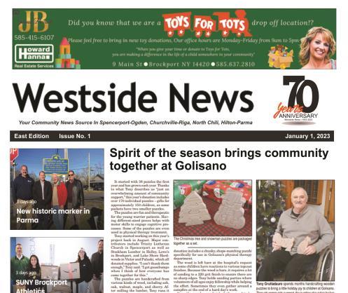Our award-winning weekly community news publication Westside News is distributed to over 26,000 homes in the western suburbs of Rochester, New York including Bergen, Brockport-Sweden, Chili, Churchville-Riga, Clarendon, Clarkson, Hamlin, Hilton-Parma, Holley, Kendall, Murray, North Chili, North Greece, and SpencerportOgden. In 2023 we are celebrating our 70th Anniversary!