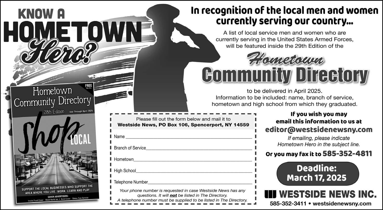 Published each Sunday by Westside News Inc., Westside News circulates by private carrier and the U.S. Postal Service to free distribution recipients and paid subscribers in Bergen, Brockport-Sweden, Chili, Churchville-Riga, Clarendon, Clarkson, Hamlin, Hilton-Parma, Kendall, North Greece, and Spencerport-Ogden. Business offices are located at 1776 Hilton-Parma Corners Road (Route 259), Spencerport, NY 14559. (585) 352-3411. Entered for mailing at Spencerport, NY 14559. Subscription rate is $90 per year.