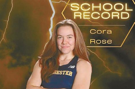 Cora Rose 2021 graduate of Brockport High School, set a new school record in shot put for the University of Rochester at the Liberty League Championship Meet. Cora’s throw of 13.26m (43 feet 6 inches) placed second, just one-half inch off the winning mark. Cora also took second place in the weight throw with a career best toss of 15.06 (49 feet 5 inches). Photo from @BrockportTrack on X.