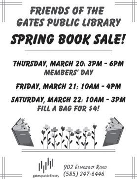 •Friends of the Gates Public Library are holding their Spring Book Sale at the library, 902 Elmgrove Road, Rochester. Members’ Day is Thursday, March 20, from 3 to 6 p.m. The sale is open to the public on Friday, March 21, from 10 a.m. to 4 p.m., and Saturday, March 22, from 10 a.m. to 3 p.m. (fill a bag for $4). For information, call 247-6446.