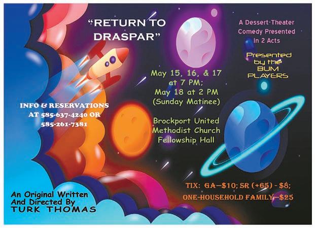 searching for a way to return to their beloved home of Draspar, the planet from which they came in the Andromeda Galaxy. Unbeknownst to them, Draspar’s Supreme Commander has been searching for them, thinking they have deserted. He has sent a spy/bounty hunter, in the guise of a young girl, Taylor Cole (Helen Schofield), to bring them back to Draspar. How will this all end? Will Marty and Martina return to Draspar? Will they be exonerated or found guilty of desertion? Will Rex ever find what he is truly looking for? Will Taylor collect her bounty? Will Amber ever get her mind right? These answers and more are available with the price of admission. The play will be artistically directed by playwright Turk Thomas. Serving as Co-Technical Directors are Thomas and Richardson. Tickets are available in the Church Office between 9 a.m. and noon on Tuesdays and Thursdays, or at the door the nights of the show. Tickets may also be reserved by phoning the church office at 585-637-4240 or by calling 585261-7381. Tickets are $10 general admission, $8 for seniors (age 65+), and $25 per one-family household. For a wonderful night of laughter and fun, don’t miss this show! Provided information and photos