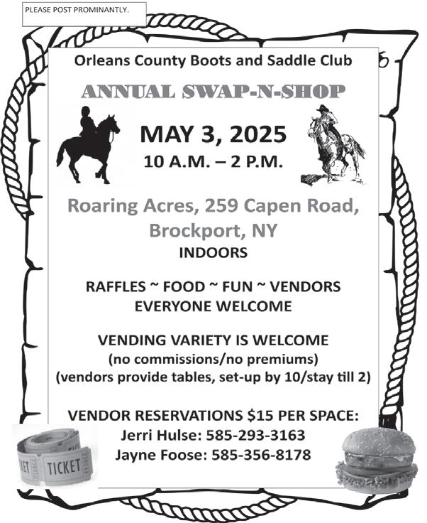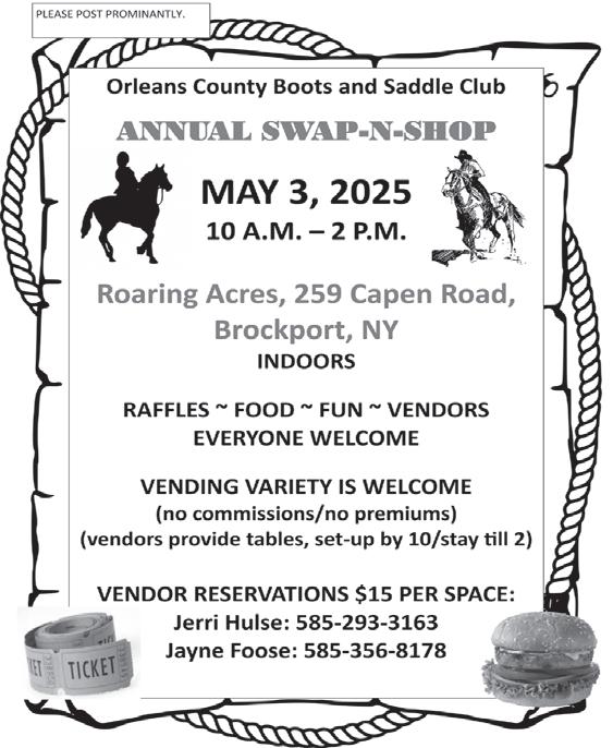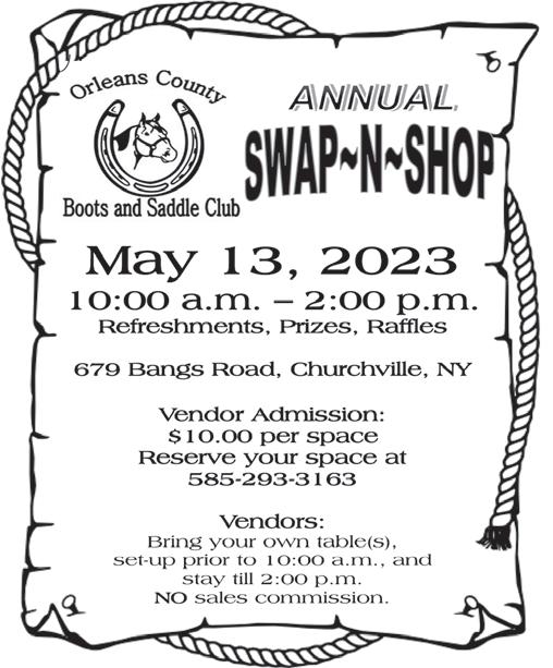 Mother’s Day Flower AuctionFriday,May 9, 10:00 a.m. and Memorial Day Flower AuctionFriday,May 23, 10:00 a.m. Orleans Produce Auction, 12590 Ridge Rd., Albion, NY 14411. Flowers for your Mother’s Day Sale, business decor, flowers for home planting, Mother’s Day gifts, hanging baskets, urns, planters, vegetable and herb plants, potted trees and shrubs and much more. Auctions Tuesdays and Fridays 10:00 a.m. Auctioneering Caleb Nicodemus 585-322-6331. [5-4]