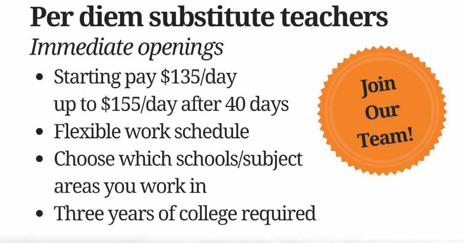 Bus Attendants & Drivers, Cafeteria Monitors, Cleaners, Food Service Helpers, Maintenance Mechanic, Senior Student Behavioral Assistant, Teacher Aides, Security Substitutes and Subs in all other areas.