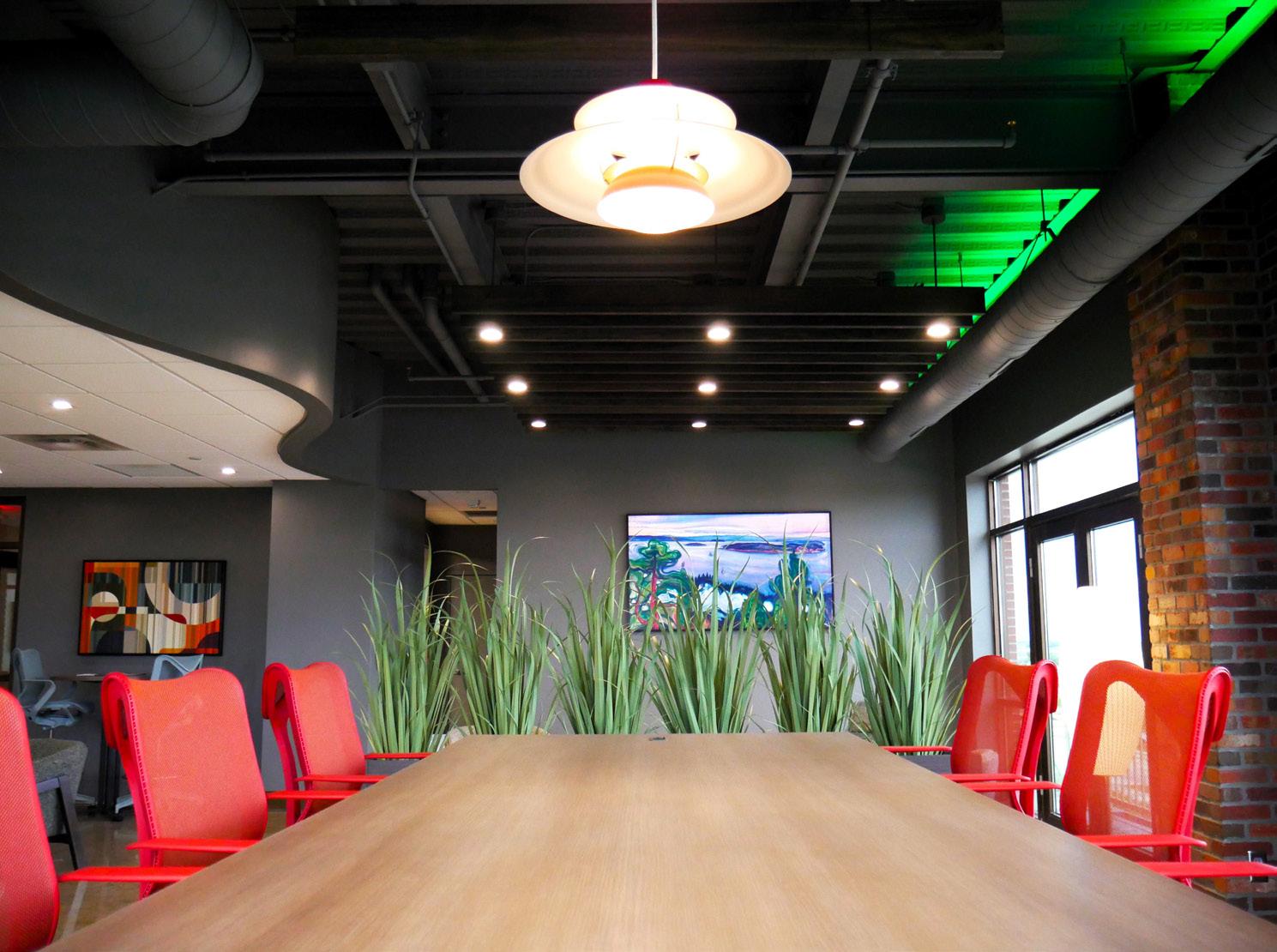 Rather than traditional cubicles, low-walled workstations from Herman Miller were selected for the main work area, giving employees a designated place to work without closing them off from customers or one another. Kaldor, LaBay, and Hanson also decided to create several small open meeting spaces and small huddle rooms to encourage collaboration among teammates. A new conference room table, the Intermix Huddle Table from OFS, has quickly become a favorite amongst the InterOffice team.