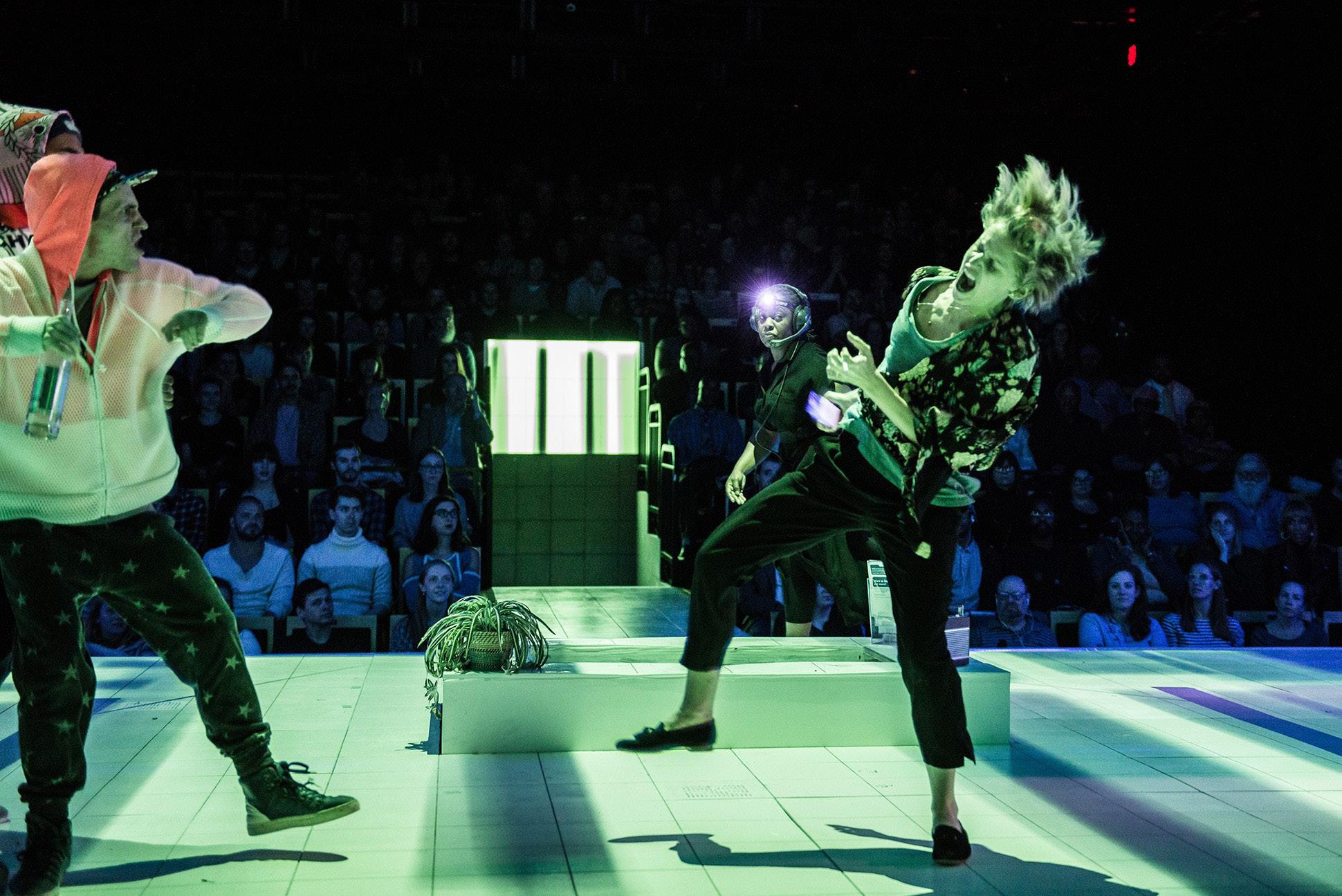 Indeed, and with plenty of respect for all ancillary performers, including the here-too-returning Kevin McMonagle, whose dual roles consistently provide muchneeded, heartfelt boosts of comedy to this distressing piece, it is this central trifecta of talent that appears to ultimately define the show as seen onstage. Christie’s geometric square-white-tiled set—forming the confines of the rehabilitation facility within which nearly all action throughout the two acts occurs—is clean, clinical, claustrophobic even, almost maddeningly minimalist, and it is through the subversion of this feeling of order that Emma’s traumatic journey towards recovery is communicated. In one outstanding moment that is, admittedly, better seen onstage than read on-page, precise projection mapping seems to rip several white tiles from their walls, rendering them eerily weightless as Emma hallucinates from withdrawal. Otherwise, furniture violently slides out from camouflaged slots hidden in the wings to shift scenes into Emma’s bedroom, tinging this theoretical sanctum with threat and discomfort; intense green strobe-lights colour the stage’s monochromes in sudden frenzied dance sequences suggesting the euphoria of relapse; and towards the end, with our heroine finally ending up at home, a platform, cut out in the centre, descends from above, locking into place to surround her as she remains still, reminding us that, throughout this play, Emma perceives herself as the helpless constant around which a cruel universe fluctuates indifferently.