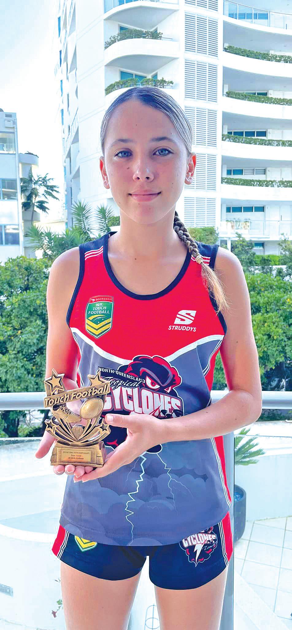 Innisfail touch football players Hannah Dryden, Lily De Brincat, Skye Barba, Lillee Barba and Summer-Rose Phair. Innisfail’s Tahlia Hayes. Skye Barba won the Coaches Player for the North Queensland Cyclones Under 16 touch football team in 2022. Hannah Dryden was one of the third highest try scorers in the NQ Cyclones Under 14 touch football team at last year’s National Youth Championships on the Gold Coast.
