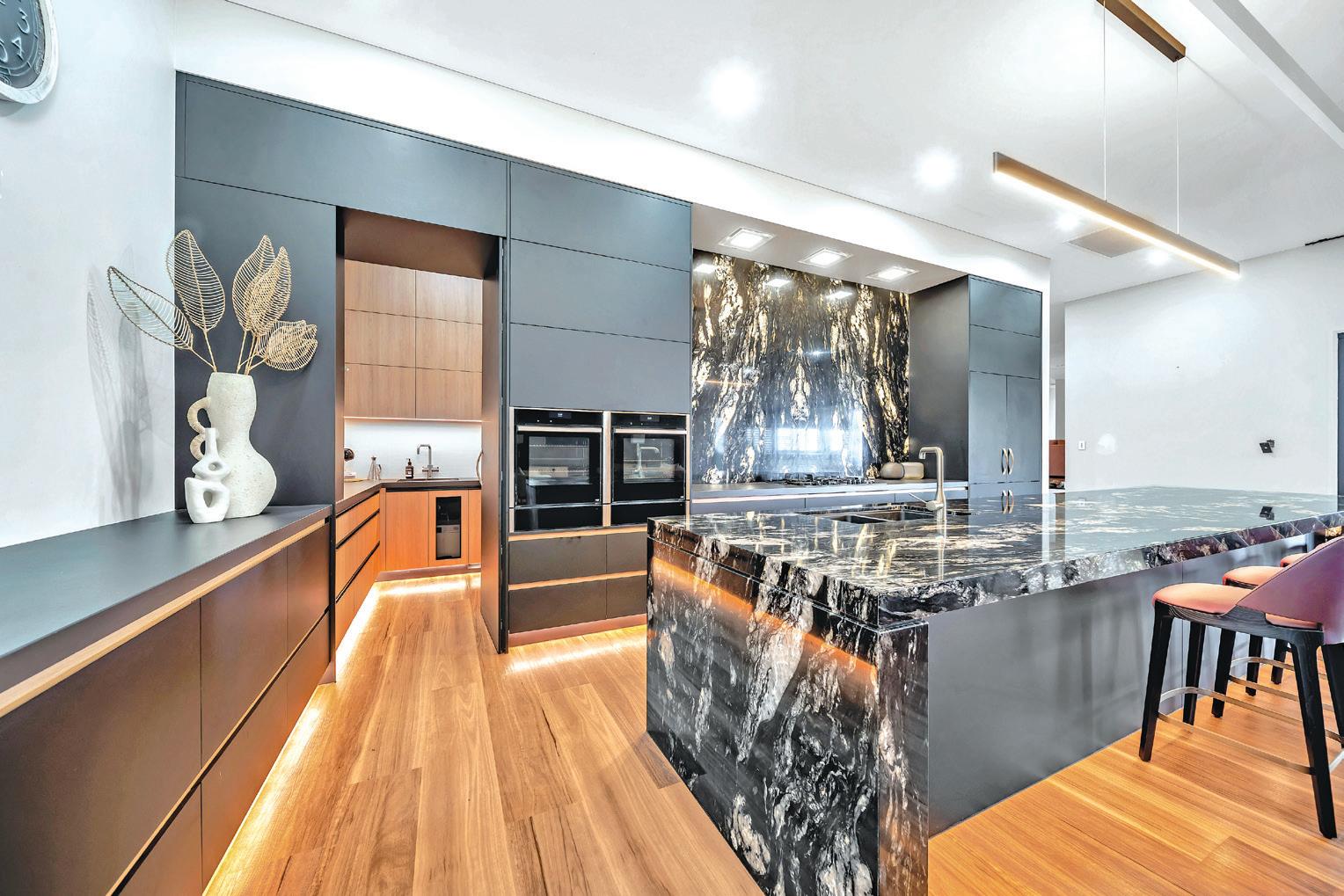 The Polytec Ultramatt Black and Formica Tassie Oak Grain cabinetry creates a sense of warmth, paired with Dekton Domoos bench tops and natural Titanium Granite.