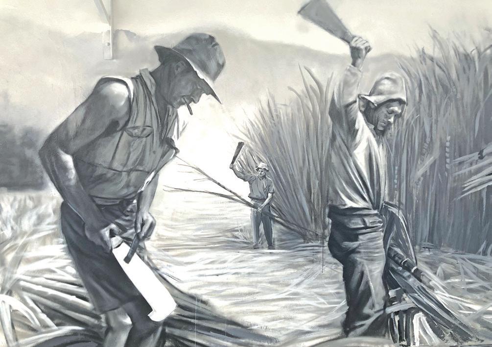 The 'Sugarcane Lane' mural illustrates the sugar industry cycle: a farmer working a field of young cane, sugarcane cutter gangs at work in the field cutting cane by hand, a sugarcane train crossing the creek to the Babinda Mill and the 'slack' season.