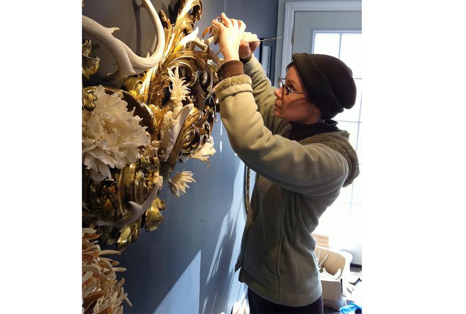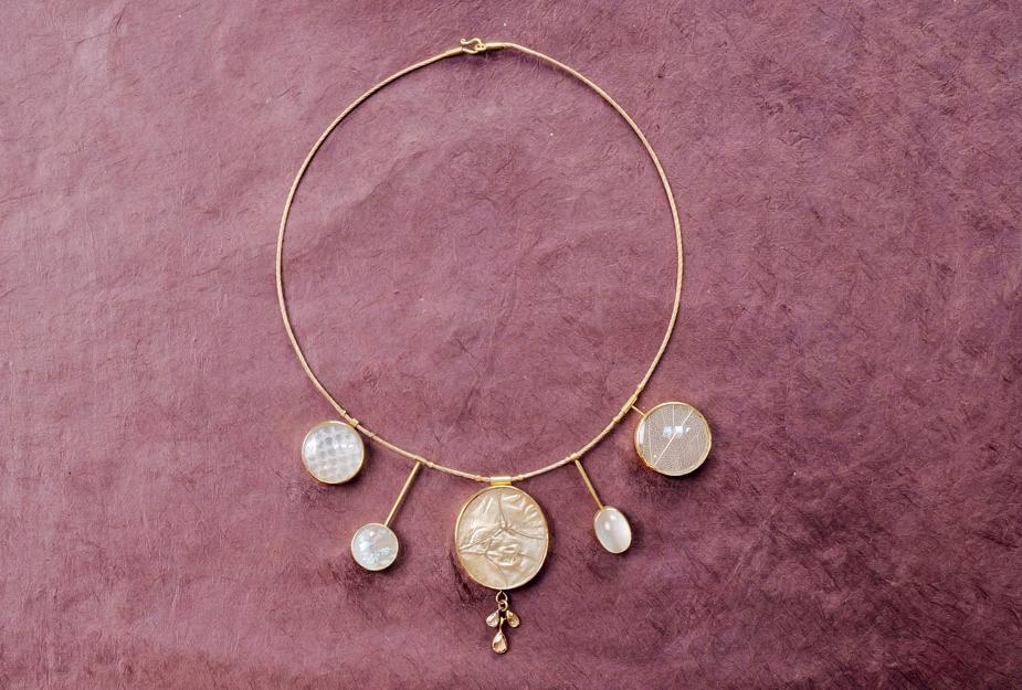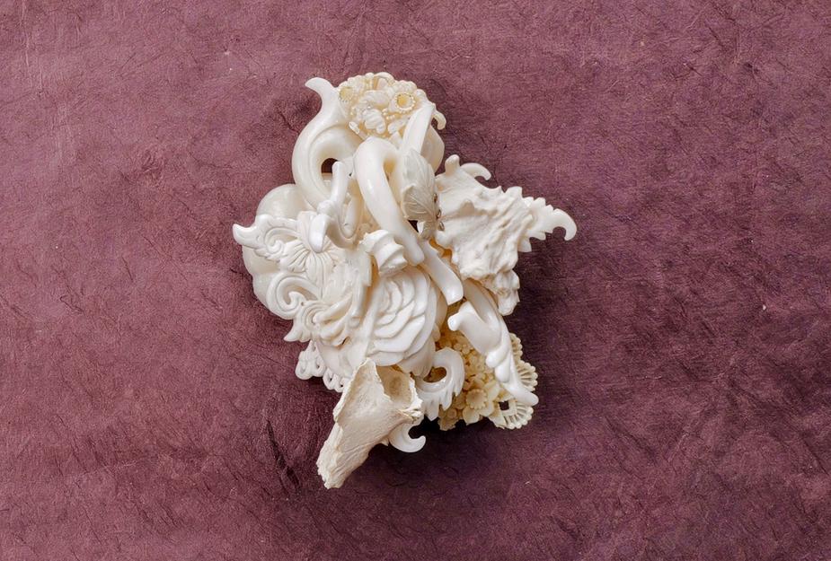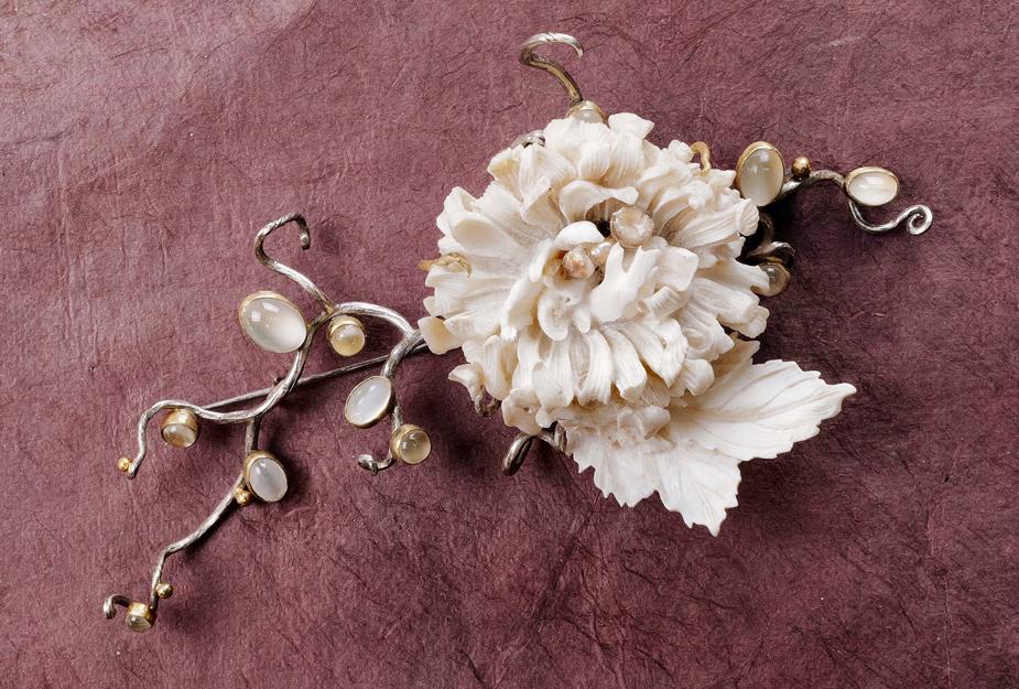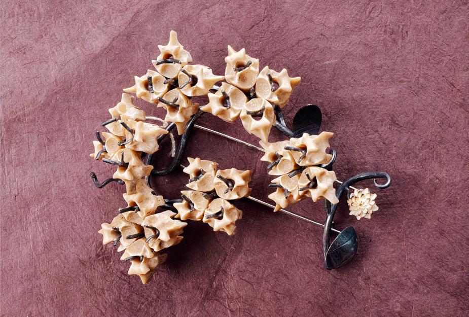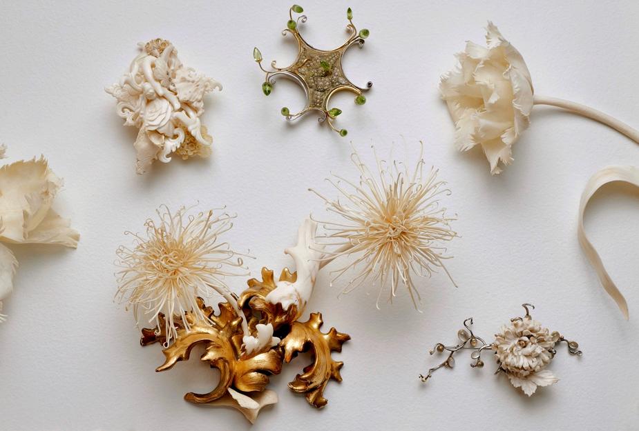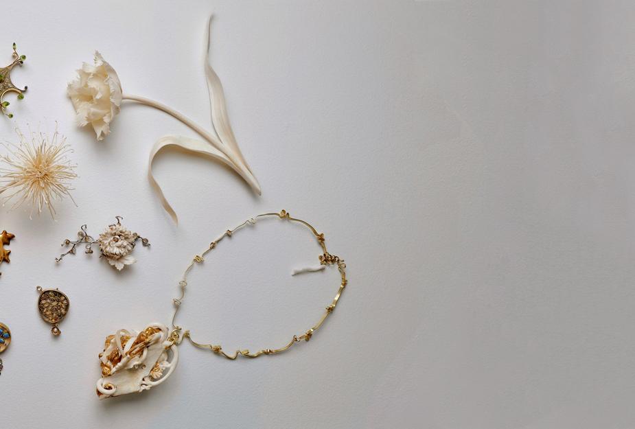 Jennifer Trask is a fine artist and jeweler whose work centers on transformation, material history, and the tension between nature and artifice. At the core of her practice is sculpture. Jewelry emerges organically from this sculptural language, functioning as an intimate extension rather than a separate discipline. Trask’s brooches, earrings, bracelets, and neckpieces are conceived as fully realized artworks, fabricated from precious metals and gemstones including opal, carnelian, and diamonds, alongside unconventional materials such as buffalo teeth, beetles, snake vertebrae, and deer antler. Many works deliberately blur the boundary between sculpture and adornment. Framed botanical tableaux and wall-mounted compositions contain detachable jewels that remain complete both on and off the body, while large-scale neckpieces contour the wearer with the physical presence of sculpture.