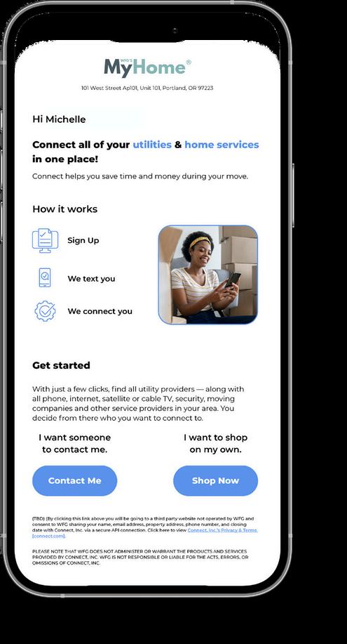 WFG’s MyHome® has partnered with Connect to provide buyers with a personal concierge that will get them connected with the toprated utilities and services. A personalized invitation will come from WFG’s MyHome® after the title report is completed. This complimentary service is totally optional!