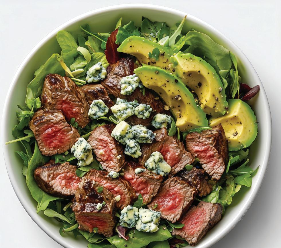 3. Arrange the greens on a large serving platter or bowl. Layer on the sliced steak, grilled onions, avocado, tomatoes, and blue cheese. Finish with a handful of fresh basil and a generous drizzle of the garlic-balsamic dressing.