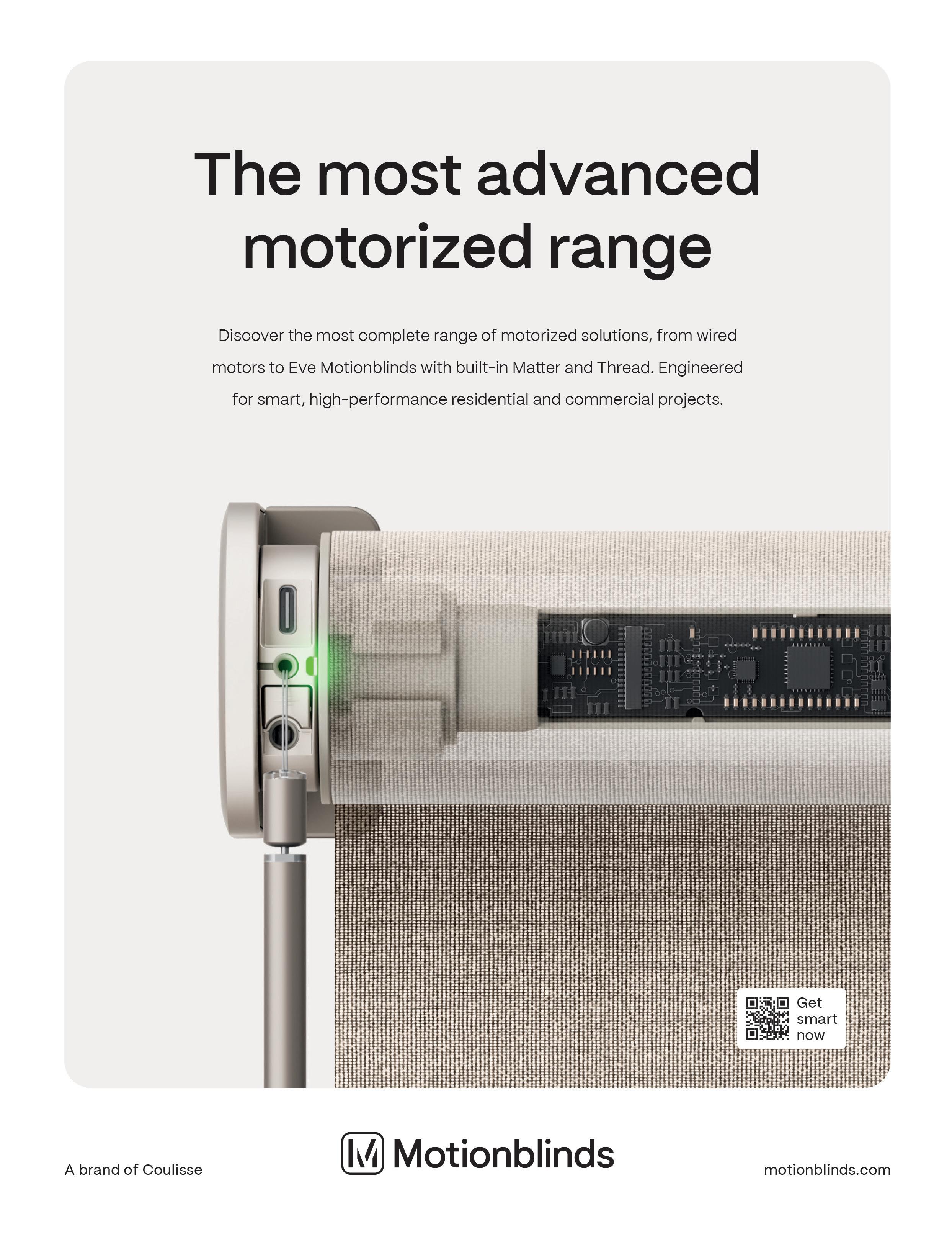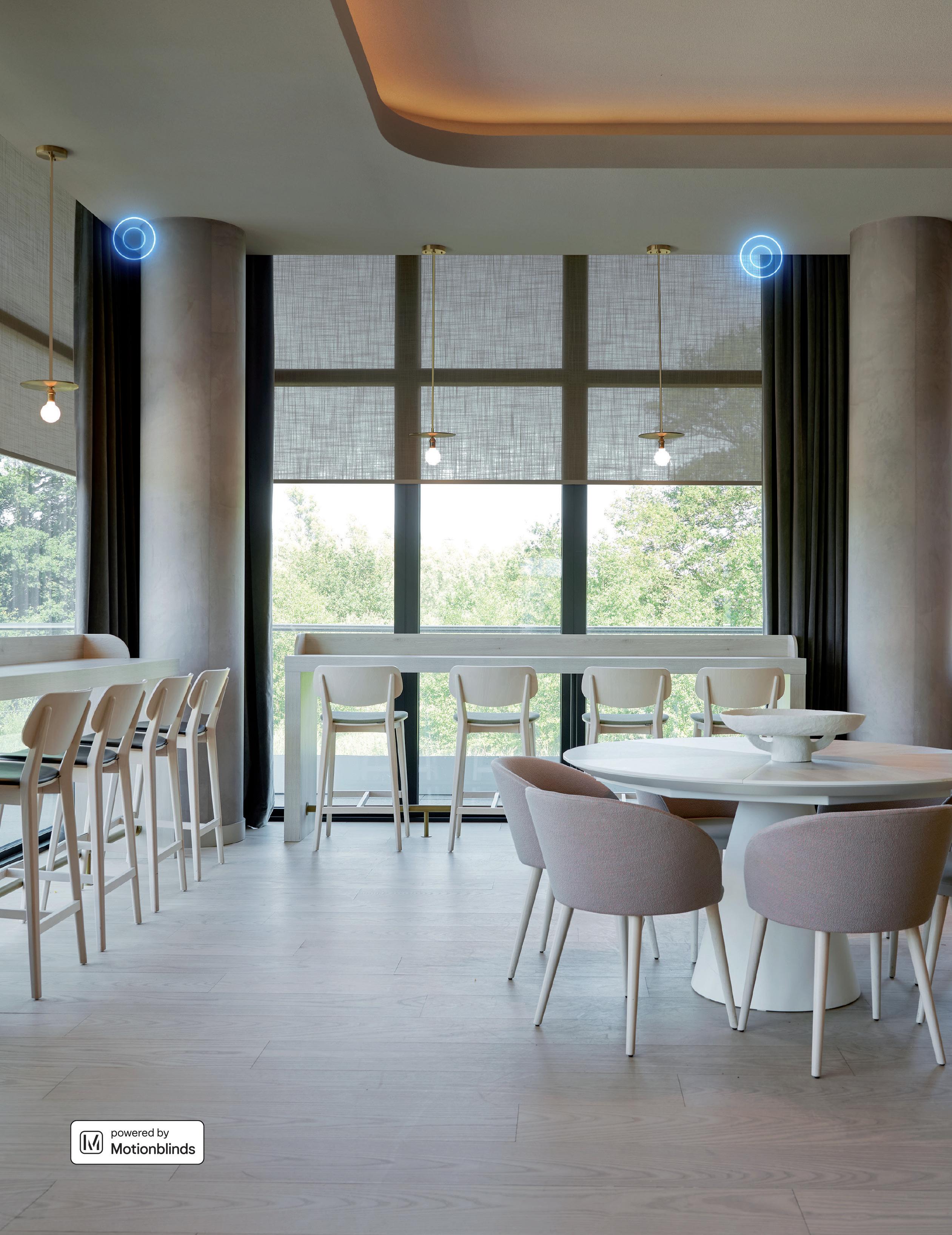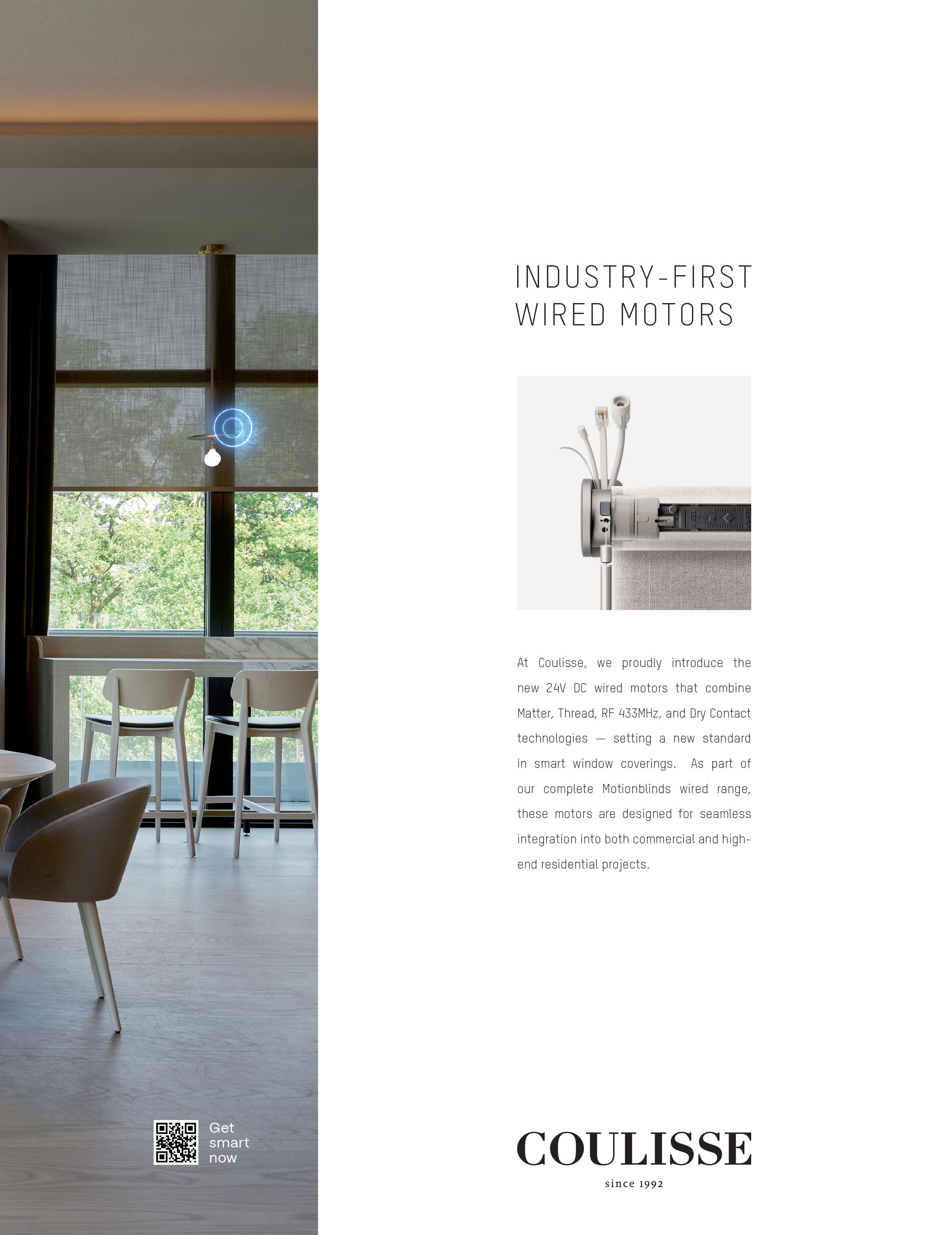 At the core of the Motionblinds wired range are the CM-50-E motors for roller, roman and the CM-51-E for curtains—the first and only 24V DC wired motors to integrate Matter, Thread, RF 433MHz and Dry Contact technologies. Engineered for plug-andplay installation, they offer seamless integration with platforms like Matter, Control4, Crestron, Savant and KNX. With advanced speed control, manual override via patented pull control and no maximum runtime, these motors ensure precise performance and reliability. Ideal for both upscale residential interiors and large-scale commercial projects, they set a new standard in wired smart shading.