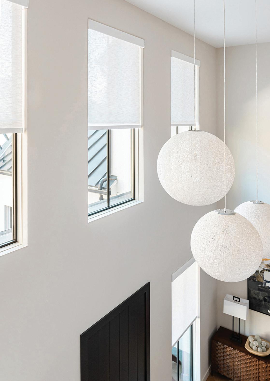 Motorized roller shades on the lower windows add an extra layer of privacy without interrupting the clean, open aesthetic. There are no cords or clutter, just smooth performance and sleek design that fits effortlessly into the space.