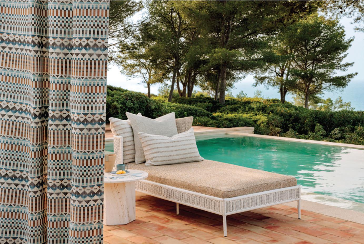 Panarea by Élitis brings playful precision to indooroutdoor living. Woven in a jacquard that mimics hand embroidery, its bold stripes and geometric motifs shift softly in color for a layered, textural effect. Equal parts artful and durable, it’s a fresh spin on performance fabric with a fashion-forward edge. Elitis.fr