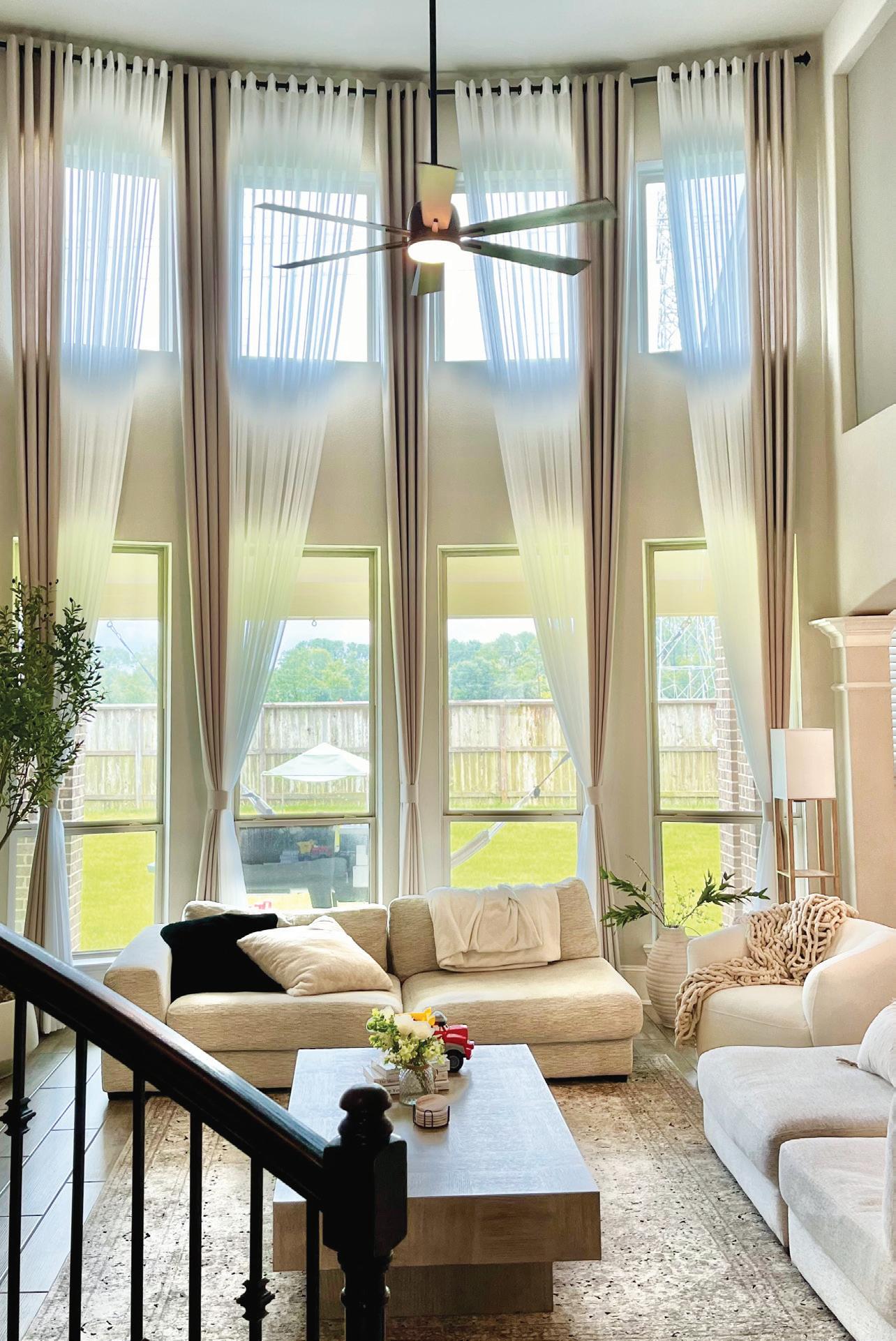 With soaring ceilings and an asymmetrical window layout, the space needed a solution that was both functional and beautiful. Designer Sunny Sun, a 2025 Grace Design Awards recipient, of Sunrise Window Fashion Inc. chose ripplefold sheers in a faux linen from Luxury Fabrics, custom fabricated to soften the light while highlighting the room’s clean lines and modern architecture.