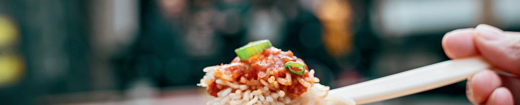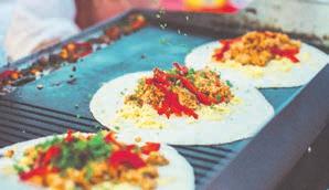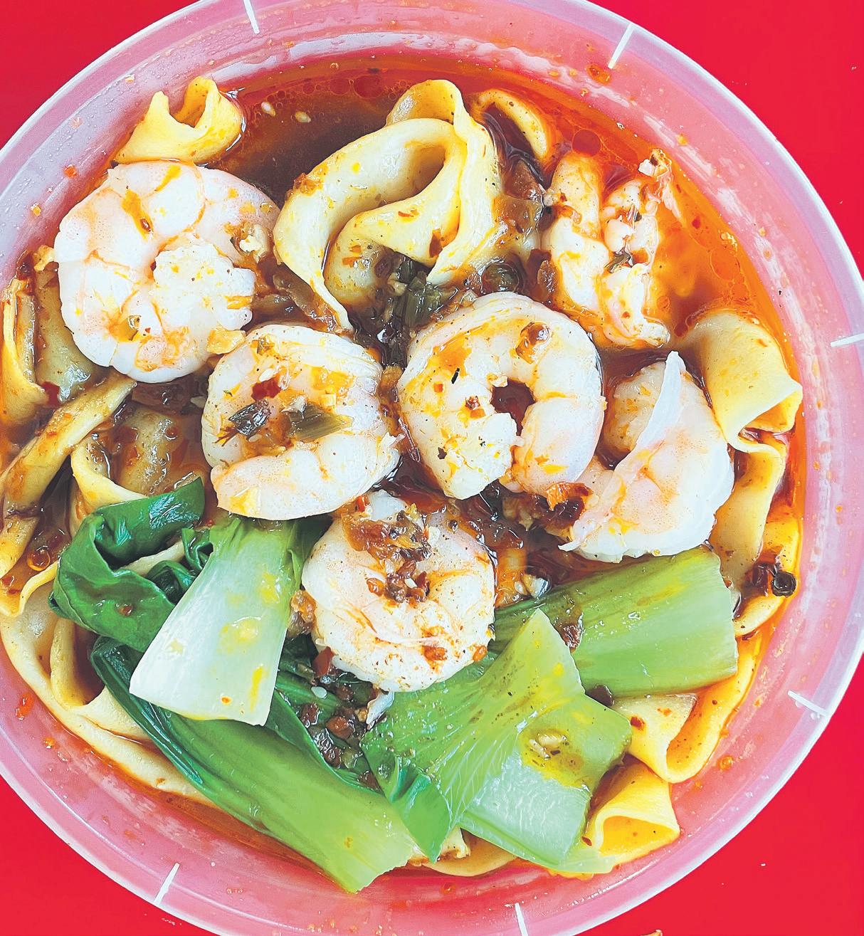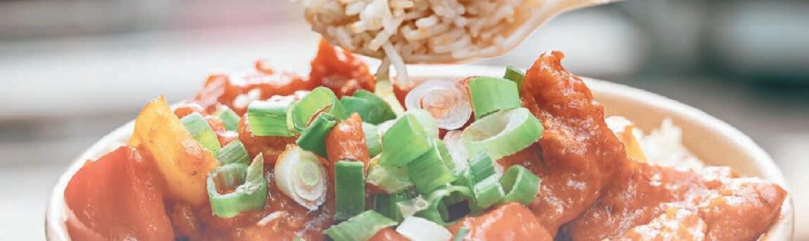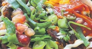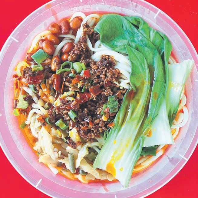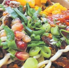 ingredients to form a melange of meat, crunchy vegetables and spices, topped off with potent sauces. It’s brightly coloured and irresistibly spicy – a comforting hug of a dish that’s warming and filling.