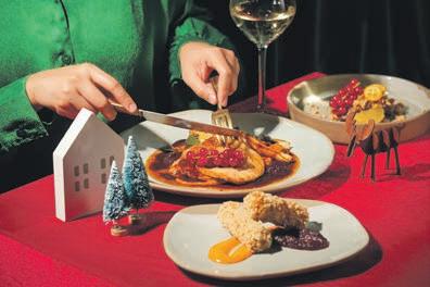 Moving on to mains, there are three options for diners. Park’s Roast Norfolk White Turkey comes with all the trimmings, namely goose fat roasted potatoes, Chantenay carrots, sautéed Brussels sprouts, turkey sausage roll, pigs in blankets, port and cranberry compote plus lashings of rich gravy. Also on the menu are Tandoori Cauli ower with mango coconut yoghurt and Hake Kiev with creamed potatoes. For dessert, there’s a rich Chocolate Mousse with mandarin gel and dark chocolate ganache.