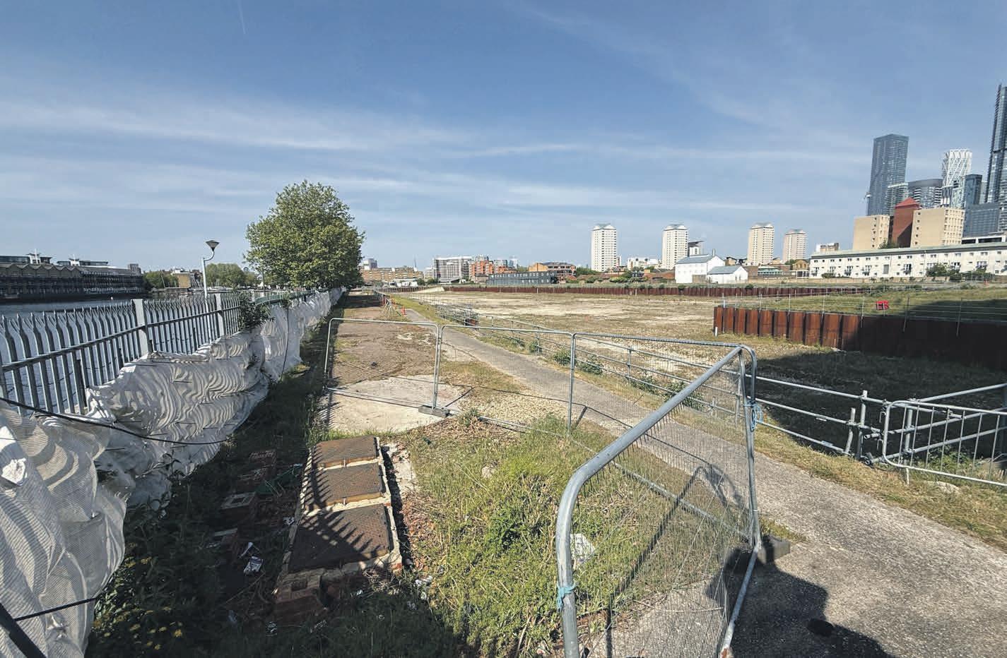Weeds and grass grow on the vacant Westferry Printworks site on the Isle Of Dogs