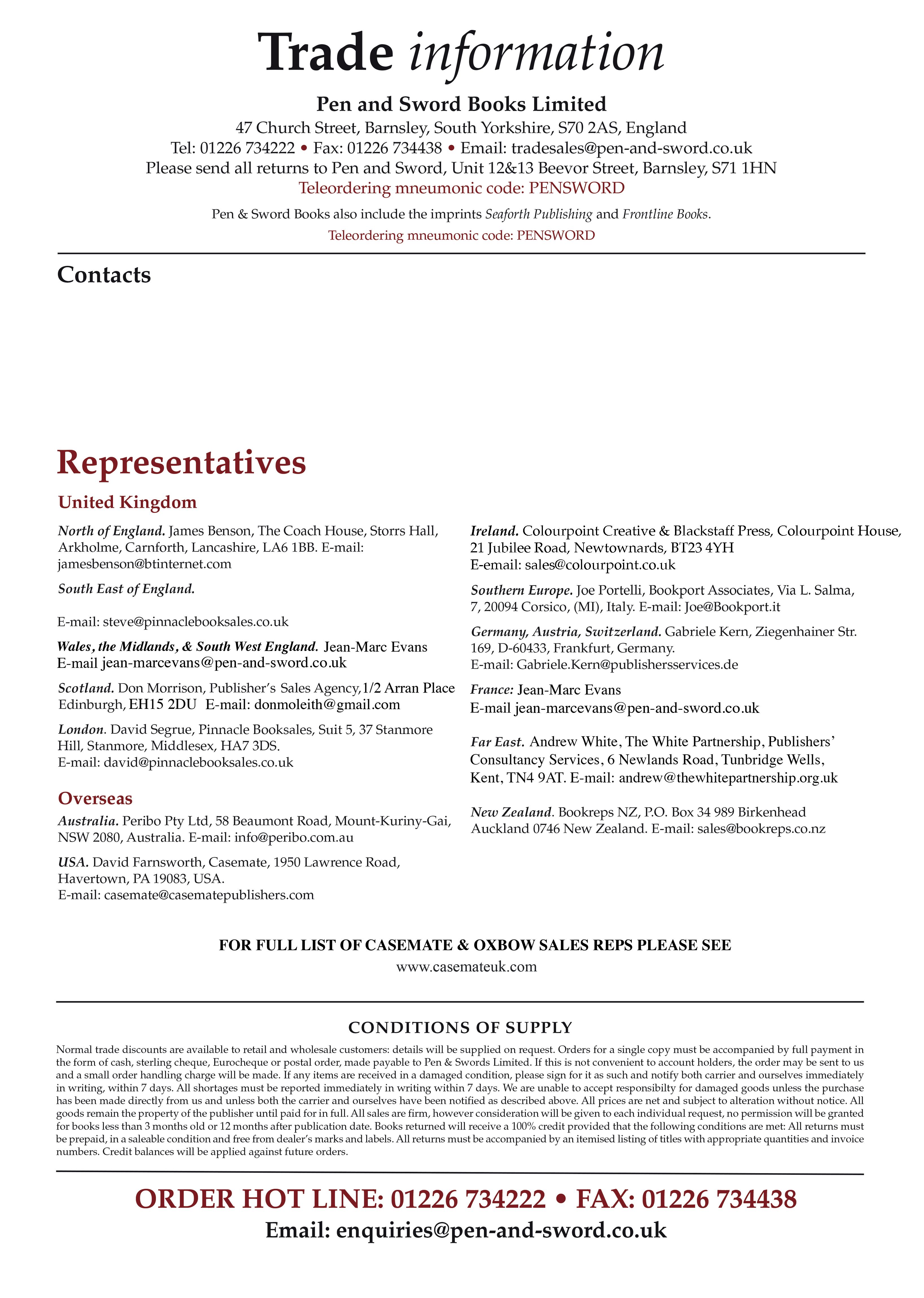 Charles Hewitt: Managing Director • Sarah Guest: Trade Sales Manager • Heather Williams: Rights Manager • Jonathan Wright: Publisher, White Owl • Phil Sidnell: Commissioning Editor • Tara Moran: Commissioning Editor • Amy Jordan: Commissioning Editor • Harriet Fielding: Commissioning Editor • Sarah-Beth Watkins: Commissioning Editor, History • Martin Mace: Frontline Books • Julian Mannering: Commissioning Editor, Seaforth Publishing • Michael Leventhal: Greenhill Books & Green Bean Books • John Scott-Morgan: Commissioning Editor, Transport will.farnsworth@casematepublishers.com