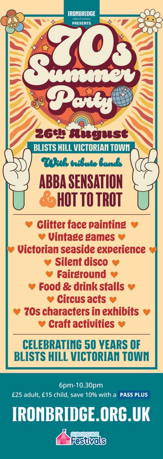 70S SUMMER PARTY Enjoy food & drink from Blists Hill’s opening era alongside music and entertainment from the 1970s, Sat 26 August, Blists Hill Victorian Town, Ironbridge