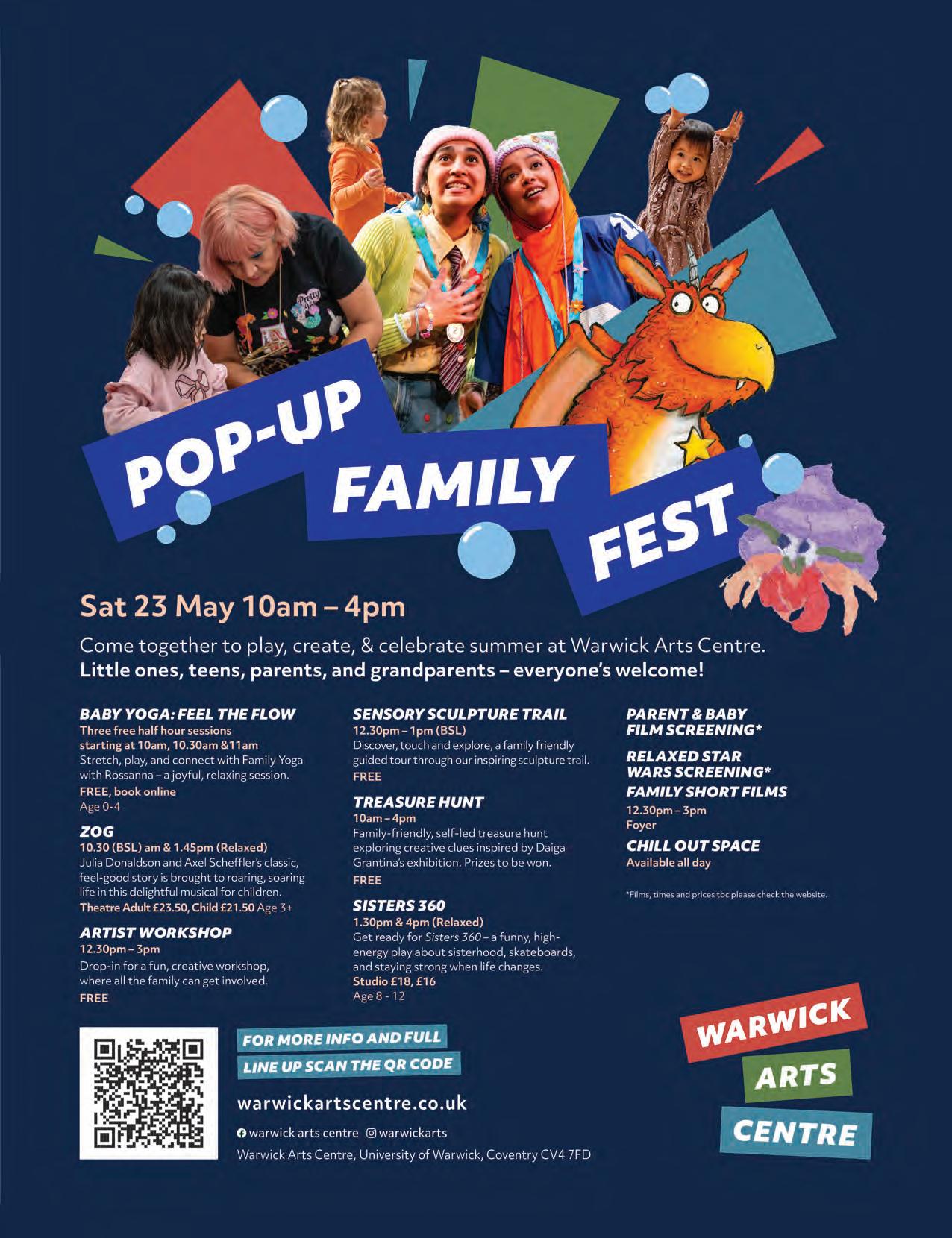 Midlands families are being invited to celebrate summer at Coventry’s Warwick Arts Centre on Saturday 23 May, courtesy of a special pop-up festival. Event highlights include family yoga, an artist-led workshop, a sensory sculpture trail, a treasure hunt, and a relaxed Star Wars screening. For further information, visit the venue’s website at warwickartscentre.co.uk