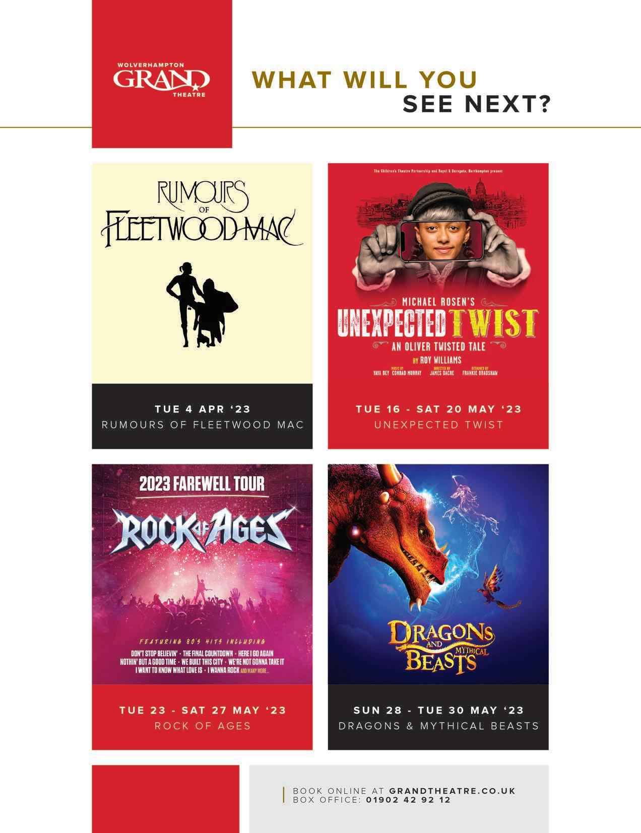 Managing Director: Davina Evans davina@whatsonlive.co.uk 01743 281708 Sales & Marketing: Chris Horton chris@whatsonlive.co.uk 01743 281704 Editorial: Lauren Foster lauren@whatsonlive.co.uk 01743 281707 : Brian O’Faolain brian@whatsonlive.co.uk 01743 281701 : Abi Whitehouse abi@whatsonlive.co.uk Subscriptions: subscriptions@whatsonlive.co.uk 01743 281714 Contributors: Graham Bostock, Katherine Ewing, Diane Parkes, Patsy Moss, Steve Adams, Steve Taylor, Sue Hull, Reggie White, Sue Jones Publisher and CEO: Martin Monahan Accounts Administrator: Julia Perry julia@21stcd.com 01743 281717 This publication is printed on paper from a sustainable source and is produced without the use of elemental chlorine. We endorse the recycling of our magazine and would encourage you to pass it on to others to read when you have finished with it. All works appearing in this publication are copyright. It is to be assumed that the copyright for material rests with the magazine unless otherwise stated. No part of this publication may be reproduced, or stored in an electronic system, transmitted in any form or by any means, electronic, mechanical, photocopied, recording or otherwise, without the prior knowledge and consent of the publishers. What’sOn March 2023 CONTENTS MEDIA GROUP What’sOn whatsonshropshire staffordshirewhatson whatsonwolverhampton Follow us at: @whatsonshrops @whatsonstaffs @whatsonwolves @whatsonshropshire @whatsonstaffs @whatsonwolves INSIDE: First Word 4 Theatre 24 Dance 38 Film 42 Visual Arts 44 Gigs 17 Events 47 Comedy 20 Food 11 06 10 13 17 42 45 49 21 22 24 36 39