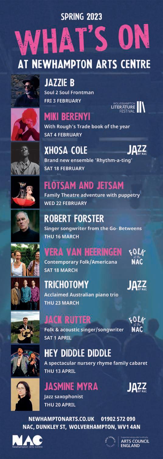The Wolverhampton venue’s 2023 programme gets under way on Saturday 18 February with a performance by Birmingham-born BBC Young Musician Jazz Award winner Xhosa Cole (pictured), who will be appearing on the night with his quartet. To find out more about NAC’s new jazz season, visit newhamptonarts.co.uk