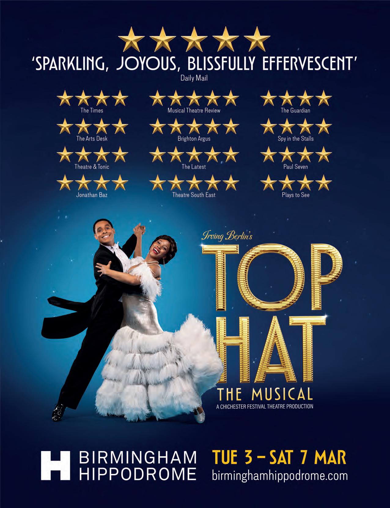 Based on the classic 1935 film starring Fred Astaire and Ginger Rogers, Top Hat is a sparkling romantic cocktail laced with witty comedy, stunning choreography and tap-dancing brilliance. The hit musical visits Birmingham Hippodrome from Tuesday 3 to Saturday 7 March... What’s On is offering one lucky reader the chance to win a pair of tickets to see the show on Tuesday the 3rd.